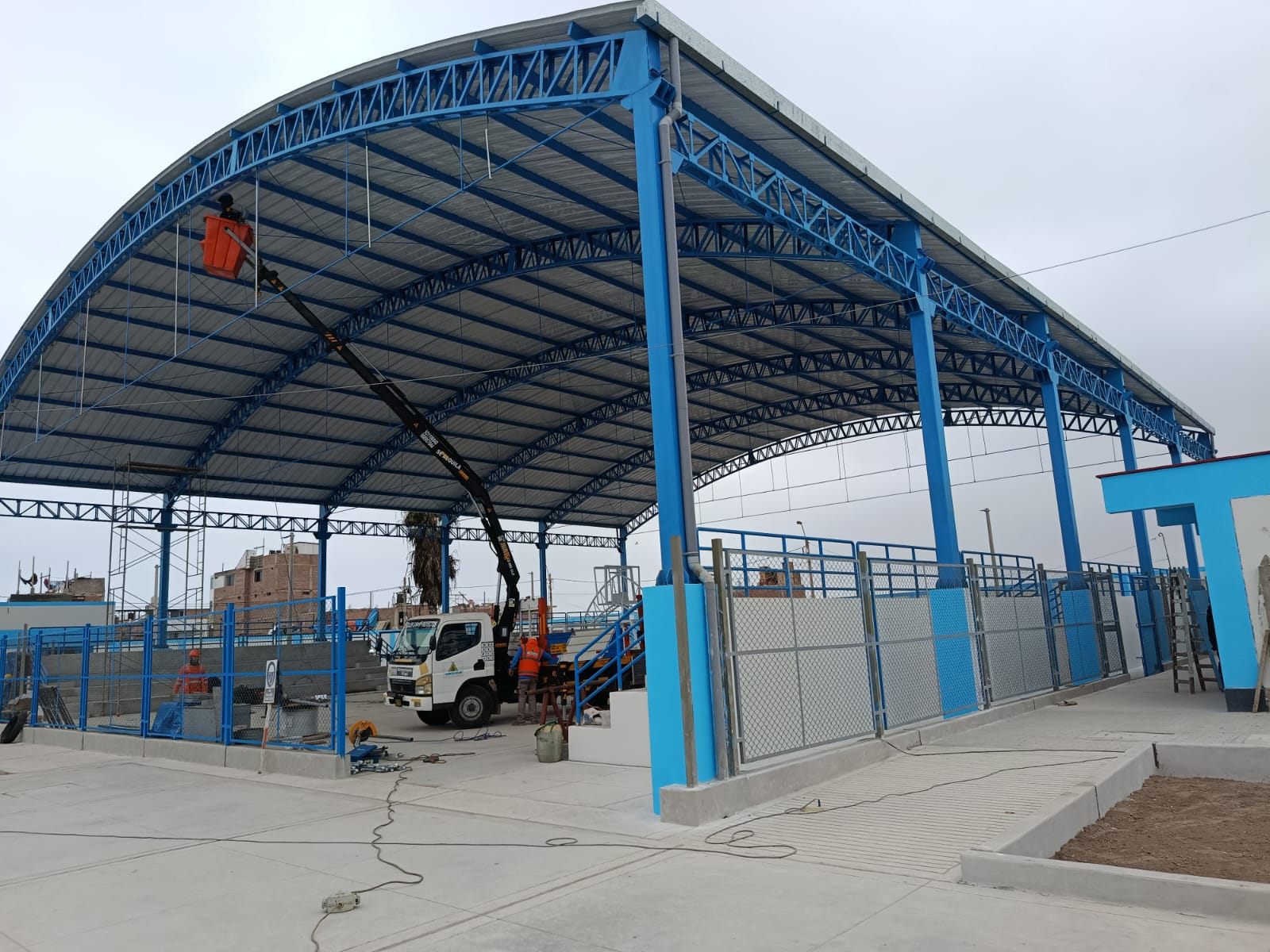 Instalación de la cobertura metálica y acabados finales. Esta fase incluyó el techado, la pintura de la estructura y la adecuación del espacio para su uso operativo cumpliendo con todas las normativas de seguridad.
