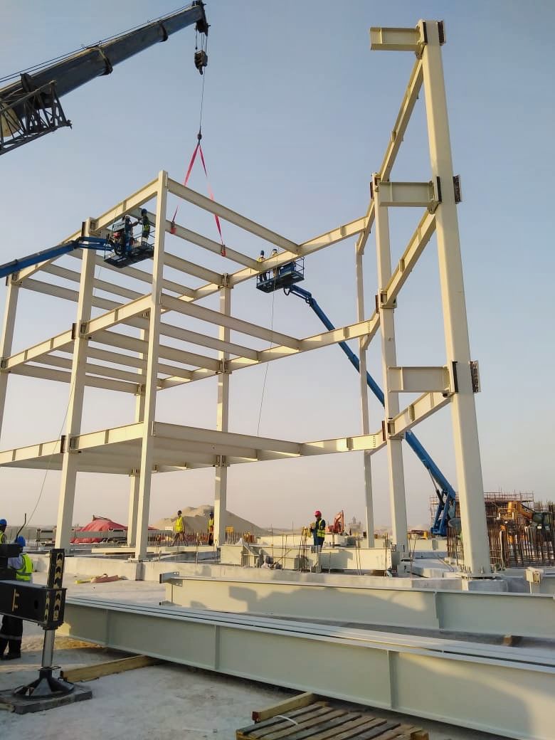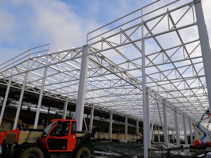 Inicio del montaje de la estructura metálica principal, con columnas y vigas de acero de gran capacidad de carga. En esta etapa se aseguró la cimentación y el ensamblaje de los primeros módulos.